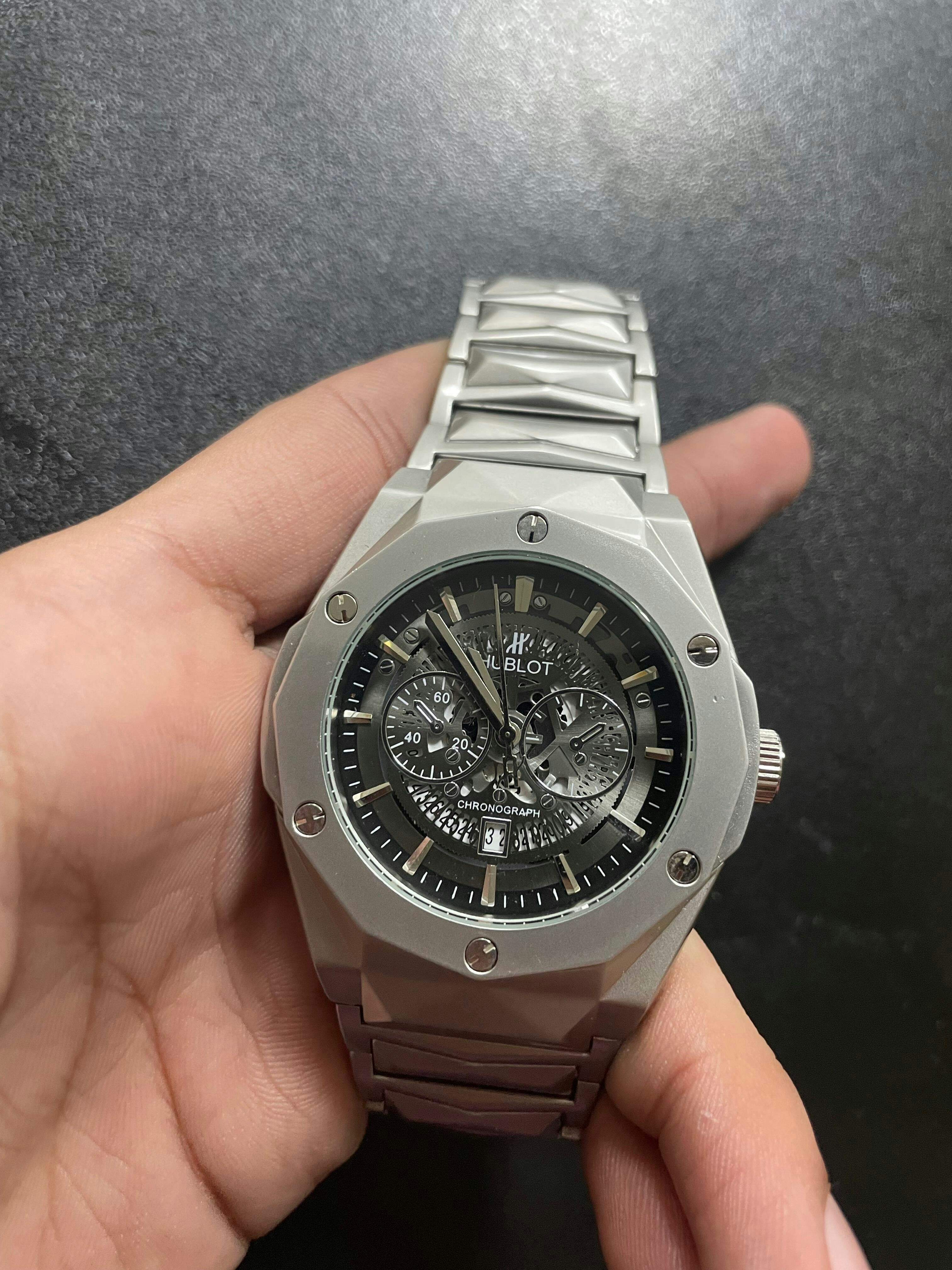 The Hublot Diamond Cut Black Dial combines a robust stainless steel case with a striking black dial, offering noticeable weight and durability. This expertly crafted timepiece reflects precision and strength, ideal for those who appreciate substantial watches. Available exclusively at Watch Studio, this model exemplifies refined craftsmanship and bold design, perfect for confident wearers seeking a statement accessory. Watch Studio ensures quality in every watch, making this Hublot black stainless steel watch a distinguished addition to your collection.
